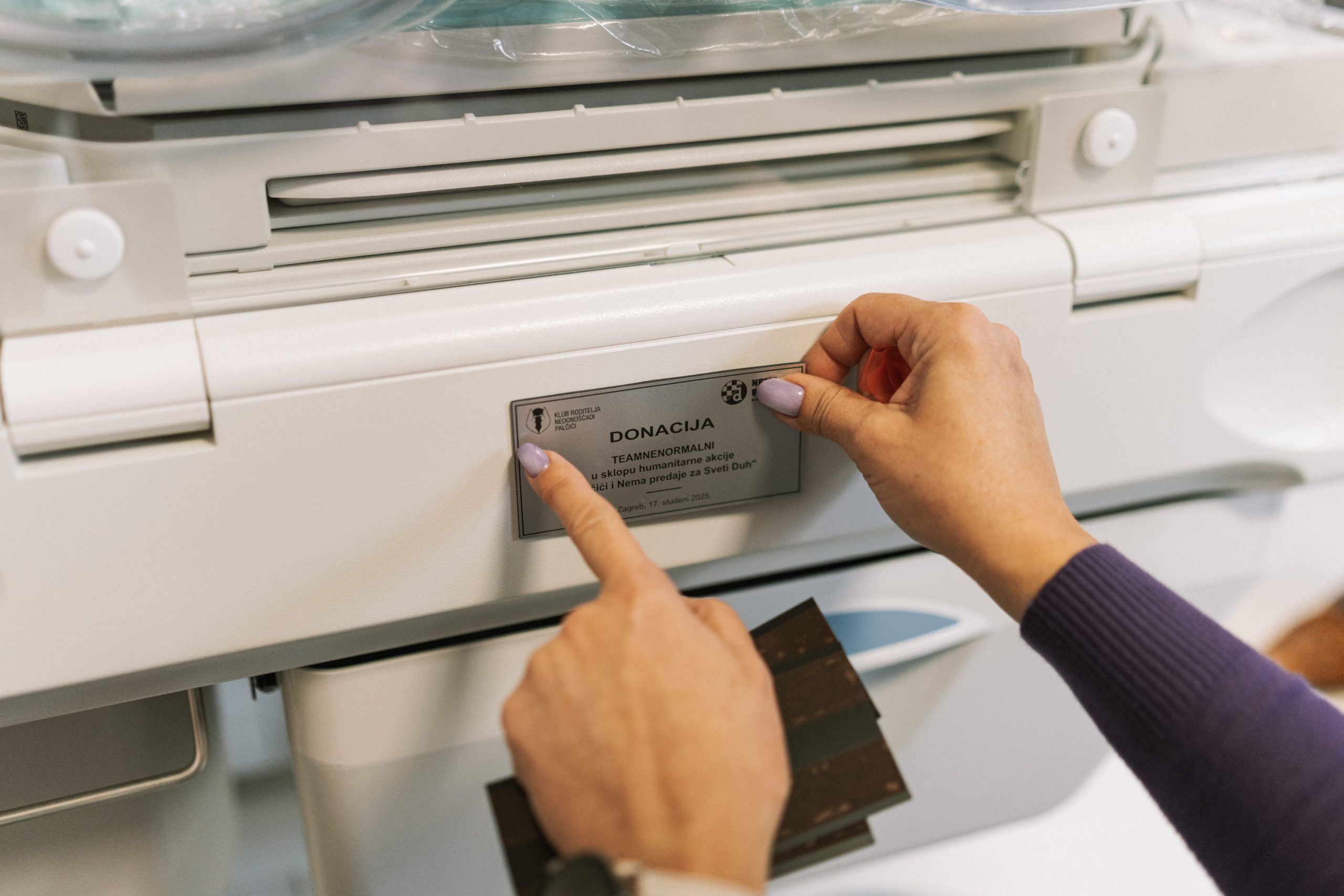 Na prigodnoj svečanosti donaciju je uručila predsjednica Kluba roditelja nedonoščadi „Palčići“, gospođa Željka Vučko i upravitelj Dinamove zaklade Nema predaje, Saša Pavličić Bekić, a u ime bolnice preuzeo ju je prof.dr.sc. Edvard Galić, prim. dr. med., ravnatelj Kliničke bolnice „Sveti Duh“.
